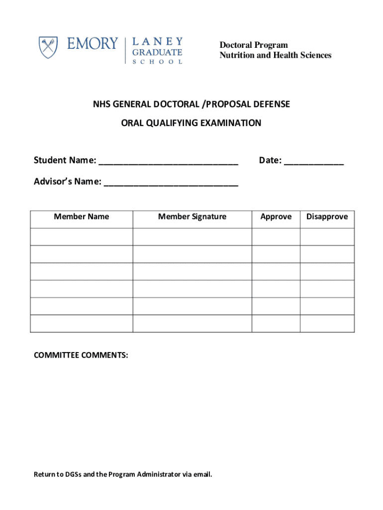 This document outlines the procedure for the oral qualifying examination for the doctoral program in Nutrition and Health Sciences. It includes sections for student and committee member names, date,