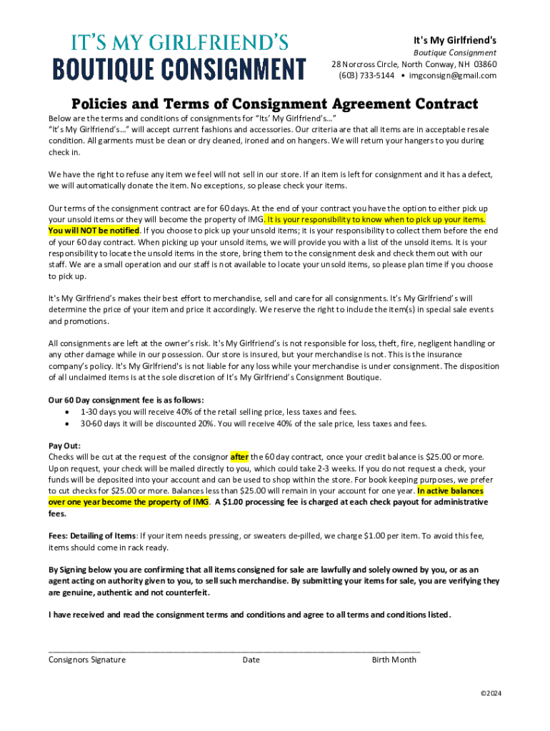 Get the free Policies and Terms of Consignment Agreement Contract