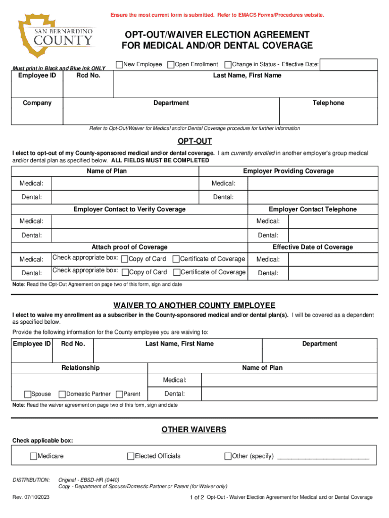 This form allows new employees to opt out or waive enrollment in County-sponsored medical and/or dental coverage. It requires detailed information about existing coverage and dependent relationships.