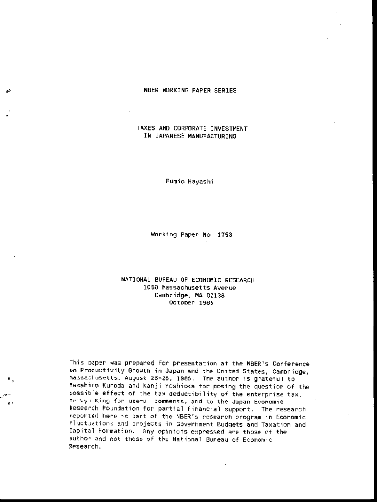 This paper examines the impact of taxes on the incentive to invest for the Japanese manufacturing sector in the postwar period, focusing on the unique aspects of the Japanese corporate tax system