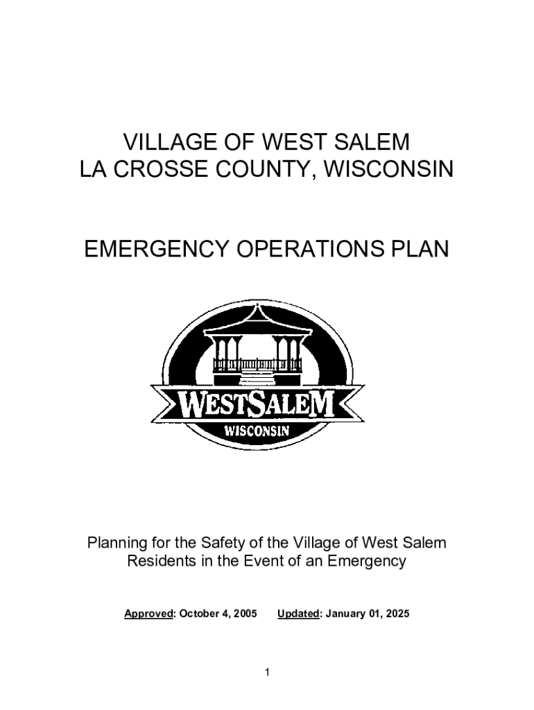 Este plan de operaciones de emergencia ha sido desarrollado para proporcionar procedimientos para que las agencias gubernamentales de la aldea de West Salem respondan a varios tipos de emergencias