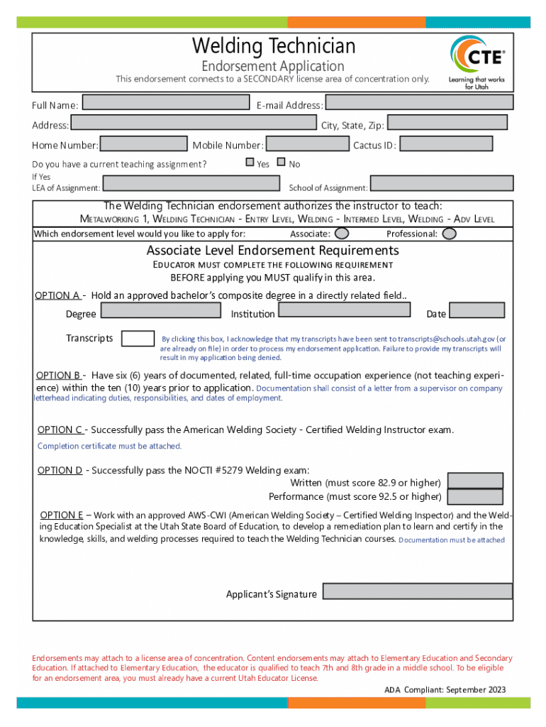 This application form is used to apply for the Welding Technician endorsement which allows instructors to teach various levels of welding courses. It details the requirements for both Associate and