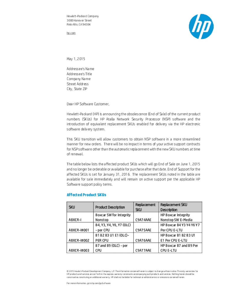 HewlettPackard Company 3000 Hanover Street Palo Alto, CA 94304 hp.comMay 1, 2015 Addressee\'s Name Addressee\'s Title Company Name Street Address City, State ZIPDear HP Software Customer, HewlettPackard