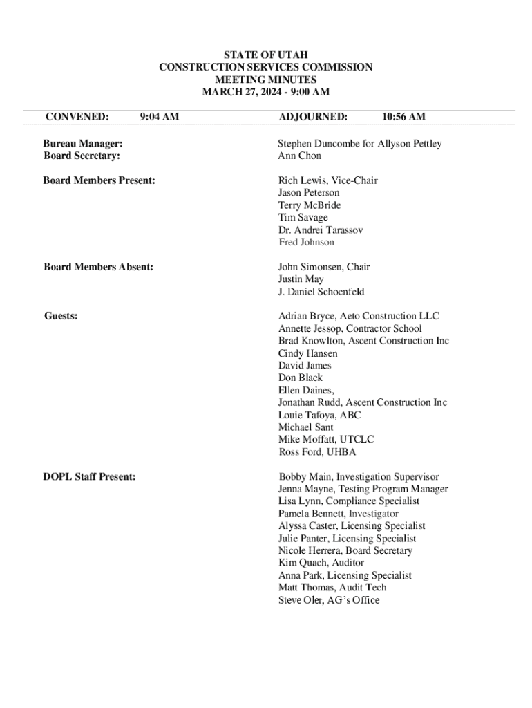 STATE OF UTAH CONSTRUCTION SERVICES COMMISSION MEETING MINUTES MARCH 27, 2024 9:00 AM CONVENED:9:04 AMADJOURNED:10:56 AMBureau Manager: Board Secretary:Stephen Duncombe for Allyson Pettley Ann ChonBoard