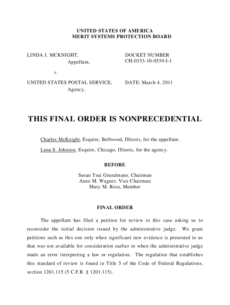 UNITED STATES OF AMERICA MERIT SYSTEMS PROTECTION BOARDLINDA J. MCKNIGHT, Appellant,DOCKET NUMBER CH0353100539I1v. UNITED STATES POSTAL SERVICE, Agency.DATE: March 4, 2011THIS FINAL ORDER IS NONPRECEDENTIAL