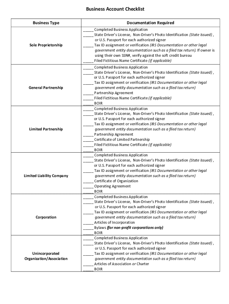 This checklist provides a comprehensive list of documentation required for various types of business entities to establish a business account. It includes requirements for Sole Proprietorships, General