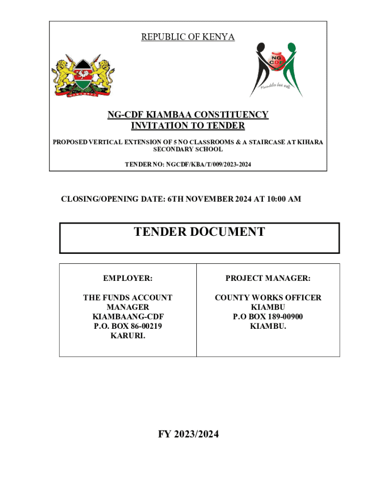 This document invites sealed tenders for the construction of the proposed vertical extension of five classrooms and a staircase at Kihara Secondary School, under the NGCDF Kiambaa Constituency. It