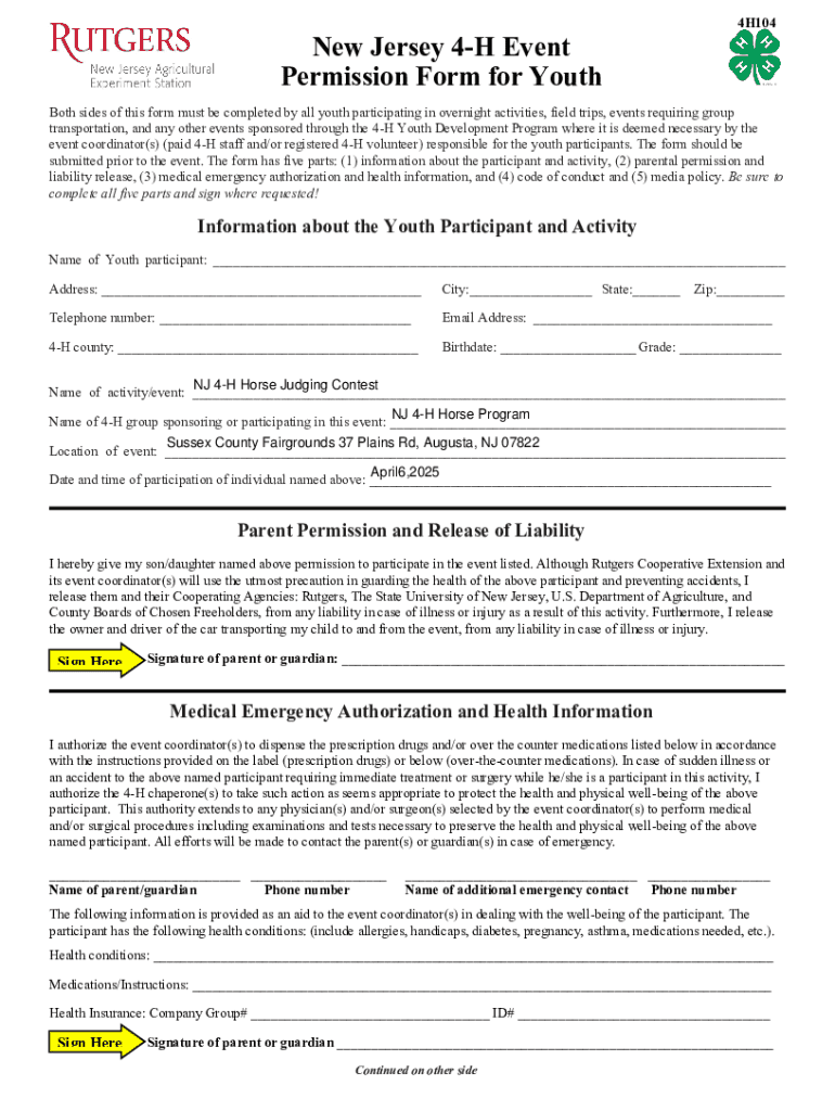 Email, fax, or share your new jersey 4-h event form via URL. You can also download, print, or export forms to your preferred cloud storage service.