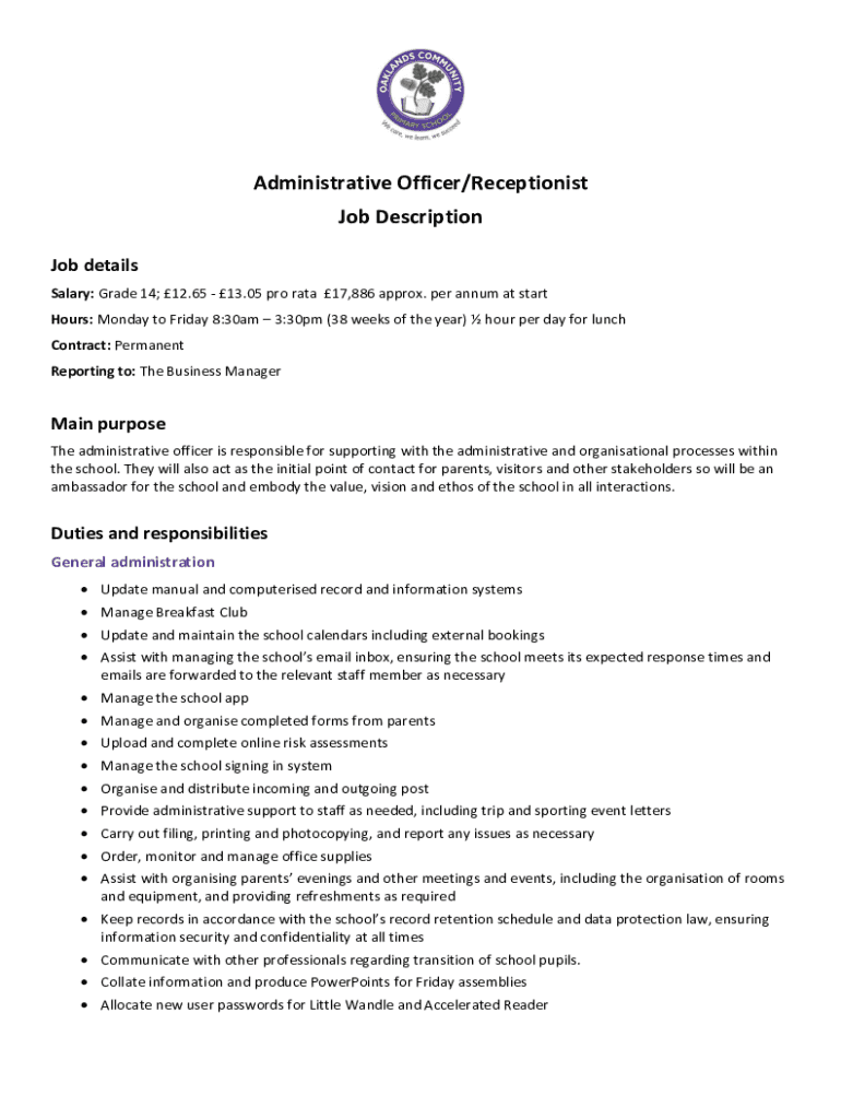 This document outlines the job description for the role of an Administrative Officer/Receptionist within a school environment, detailing responsibilities, requirements, and the overall purpose of