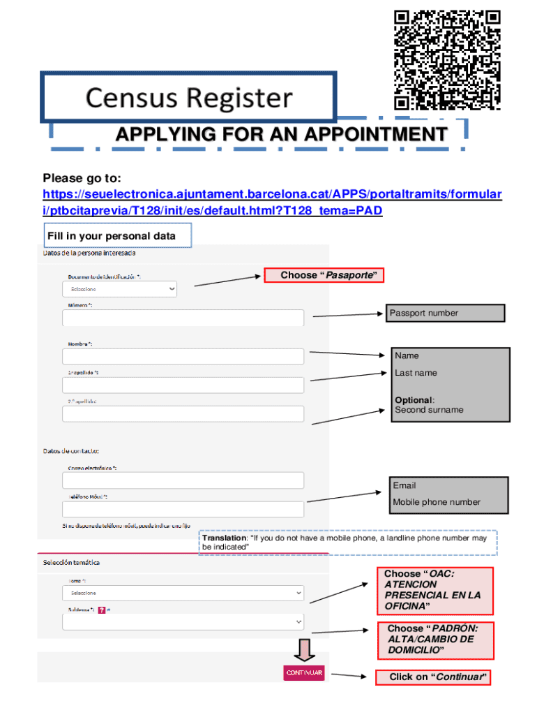 This document outlines the steps to apply for an appointment for various administrative processes in Barcelona, including filling personal information, selecting the type of appointment, and confirming