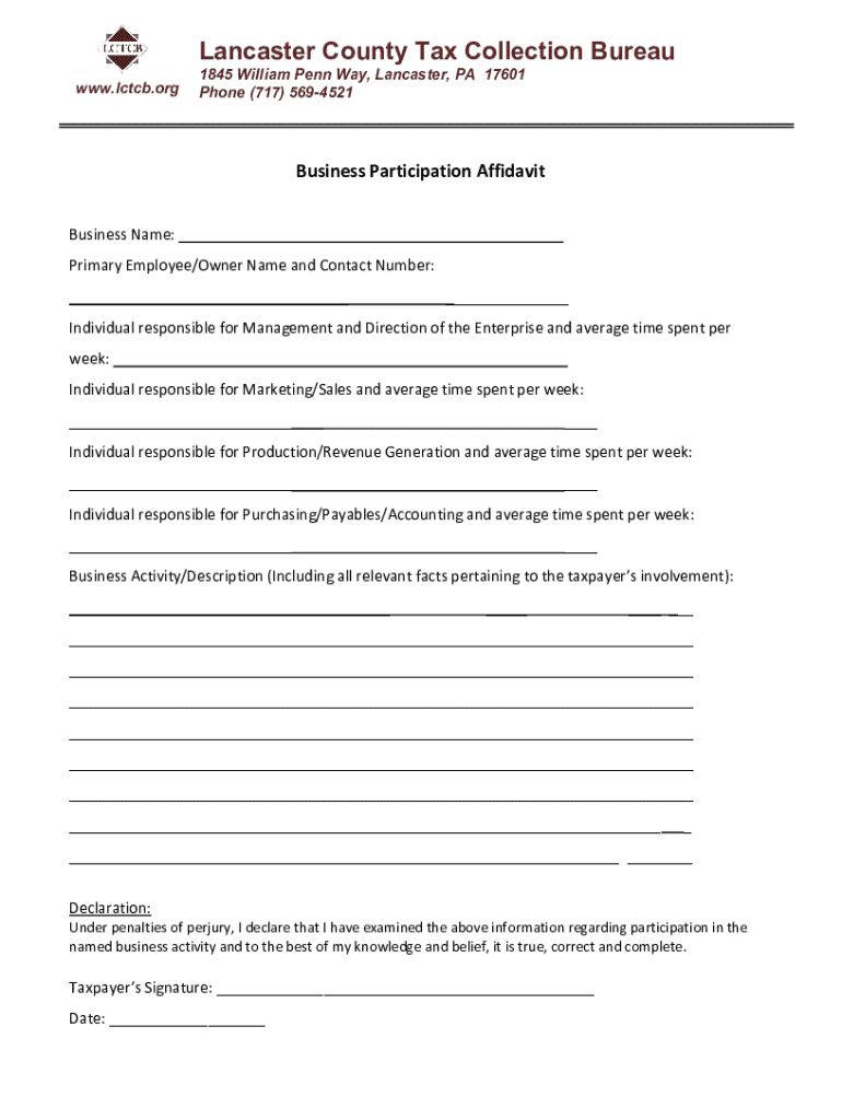 This affidavit is a formal declaration required by the Lancaster County Tax Collection Bureau for businesses to provide information about their management, activities, and tax participation. It includes