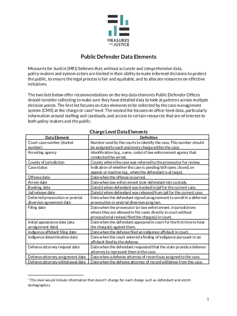 Public defender data elements refer to the specific pieces of information that are collected and reported regarding the services provided by public defenders, including case details, client demographics, and outcomes.