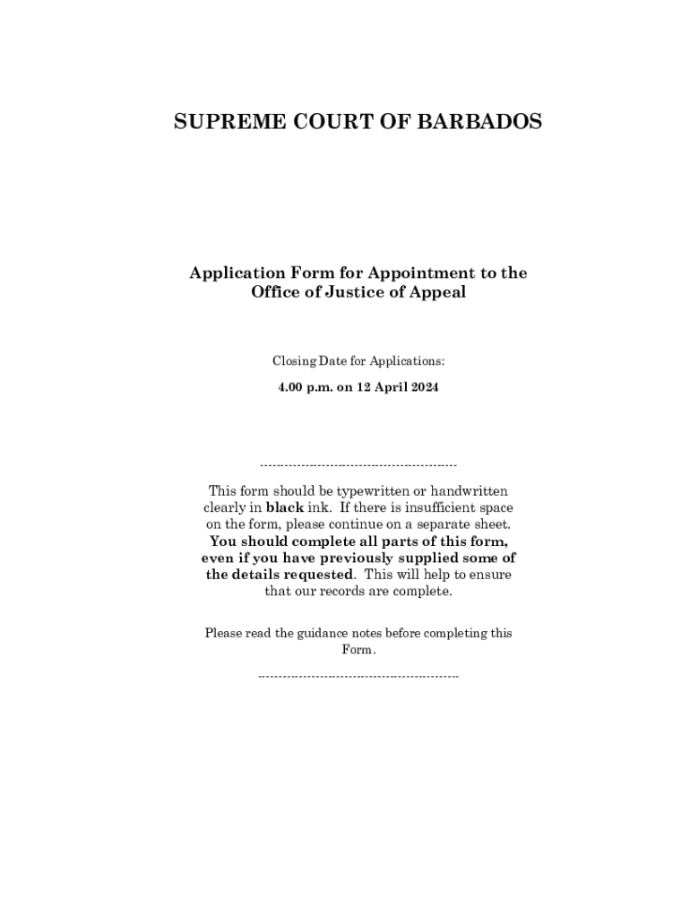 Este formulario se debe completar para postularse al cargo de Juez de Apelación en la Corte Suprema de Barbados. La fecha límite para las solicitudes es a las 4:00 p.m. del 12 de abril de 2024.