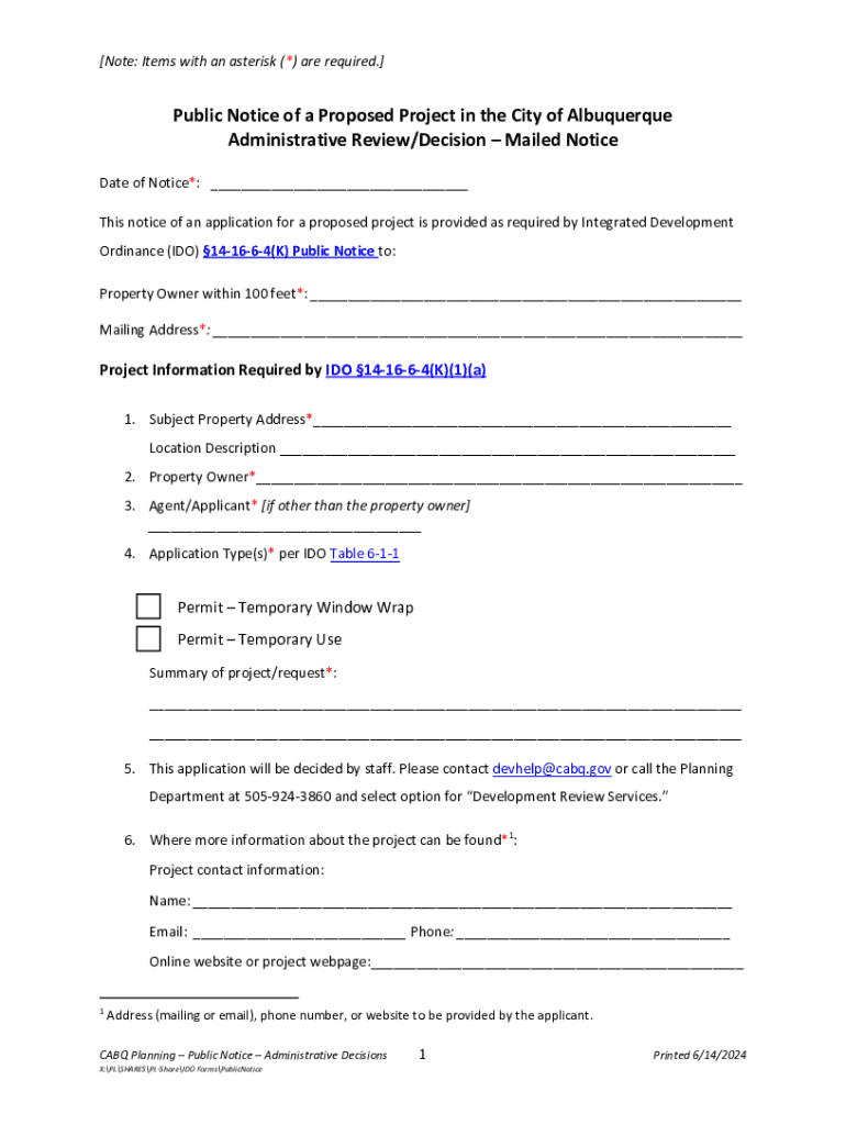 [Note: Items with an asterisk (*) are required.]Public Notice of a Proposed Project in the City of Albuquerque Administrative Review/Decision Mailed Notice Date of Notice*: ___ This notice of an application