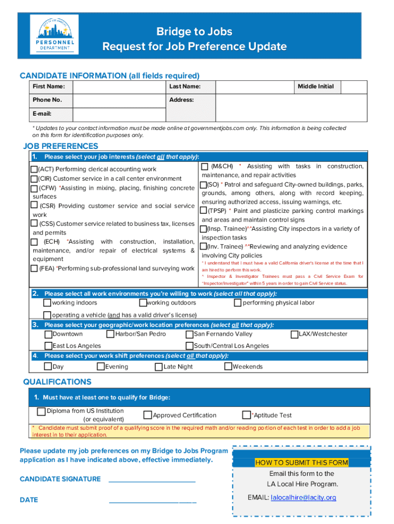 Get the free Bridge to Jobs Request for Job Preference Update - lalocalhire lacity