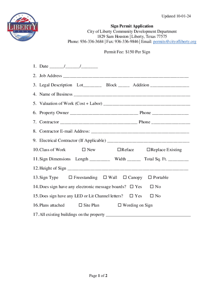 An application form for obtaining a sign permit from the City of Liberty Community Development Department, detailing the requirements and steps needed for approval.