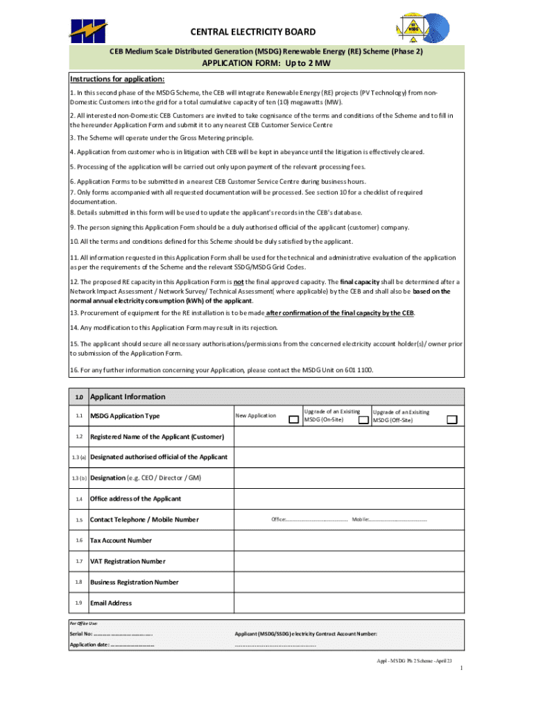This application form is for non-Domestic customers applying to integrate Renewable Energy projects into the grid under the CEB\'s MSDG Renewable Energy Scheme, with a capacity of up to 2 MW. The