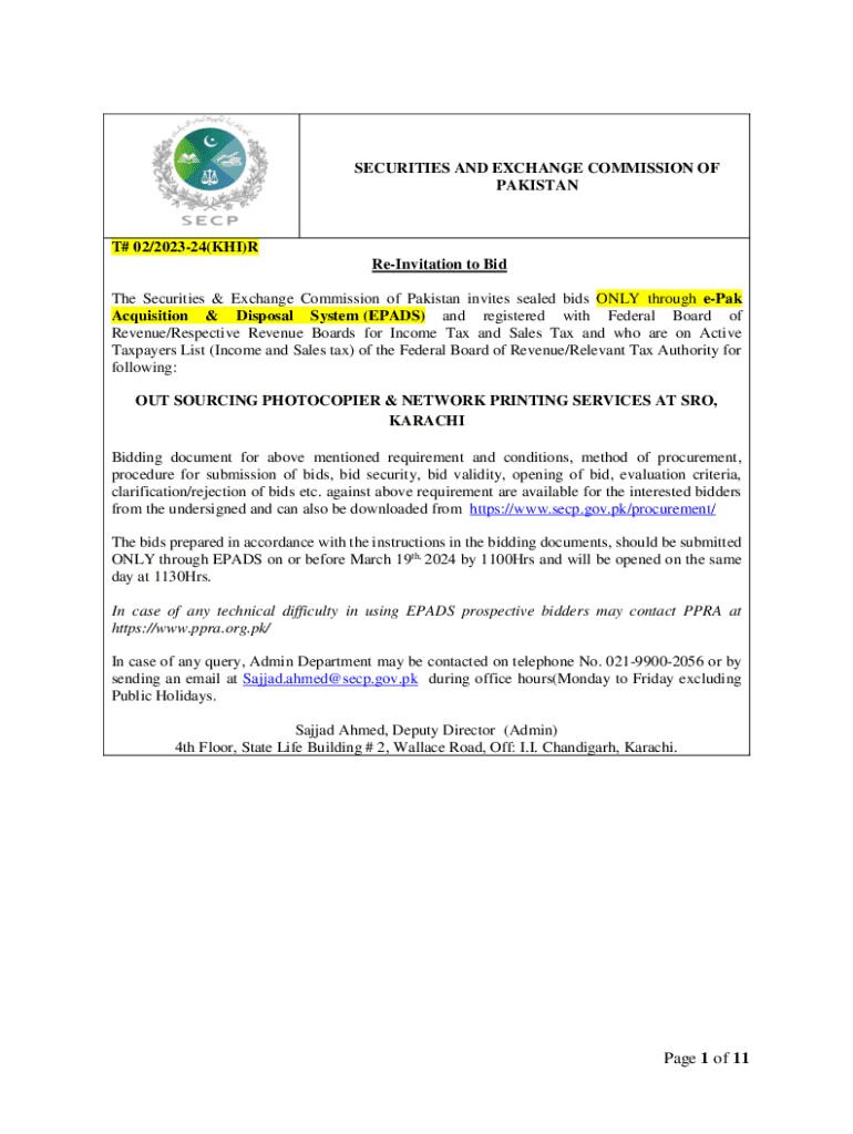 SECURITIES AND EXCHANGE COMMISSION OF PAKISTANT# 02/202324(KHI)R ReInvitation to Bid The Securities & Exchange Commission of Pakistan invites sealed bids ONLY through ePak Acquisition & Disposal System