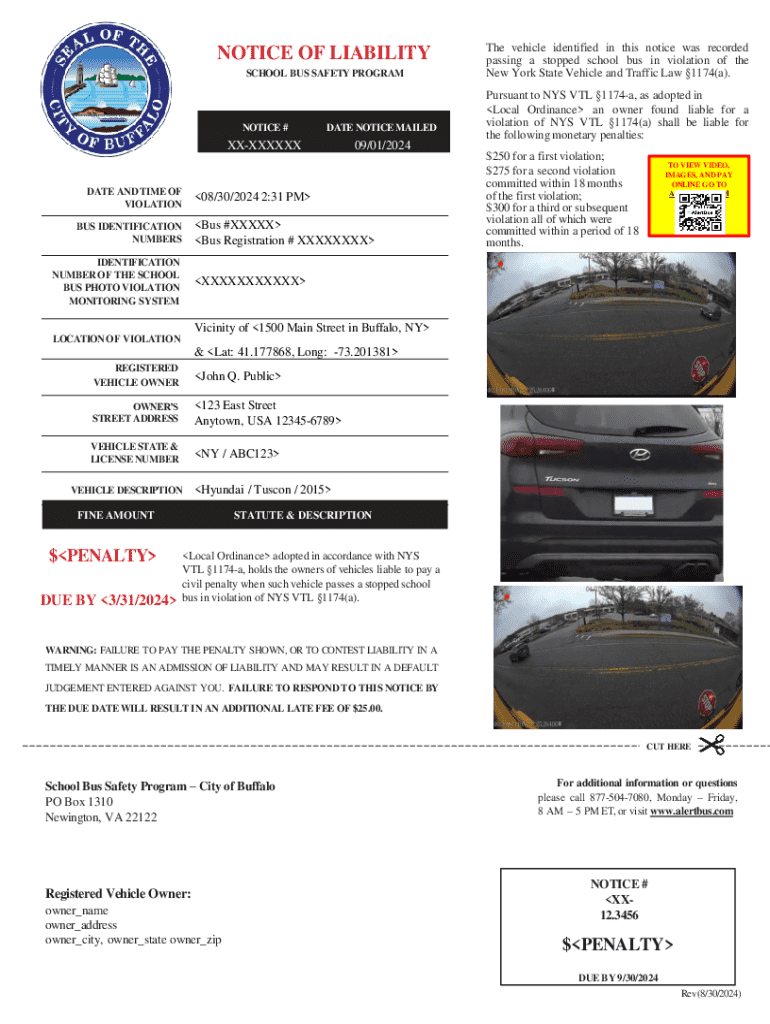 This document serves as a notice to the registered owner of a vehicle that was recorded passing a stopped school bus in violation of New York State Vehicle and Traffic Law. It outlines the penalties