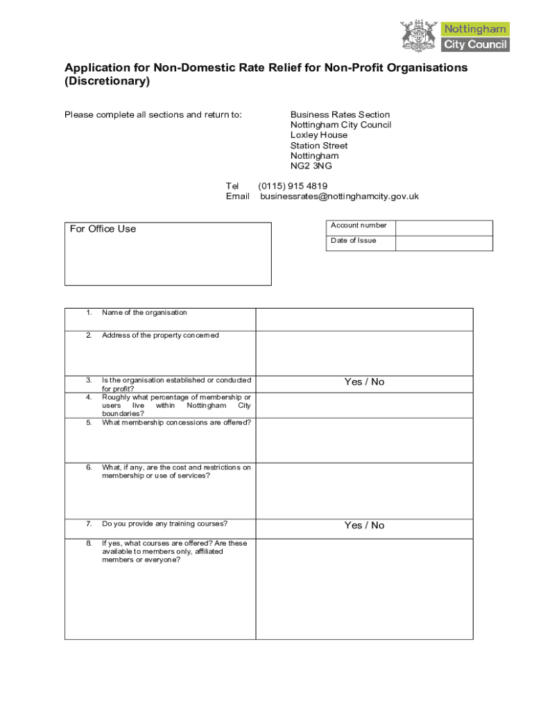 This form is required for non-profit organizations to apply for discretionary non-domestic rate relief. It includes sections to provide information about the organization, its property, and its services,