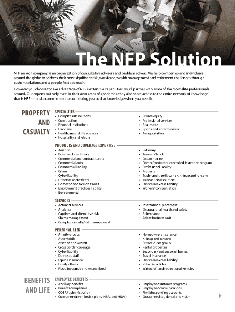 The NFP SolutionNFP, an Aon company, is an organization of consultative advisors and problem solvers. We help companies and individuals around the globe to address their most significant risk, workforce,