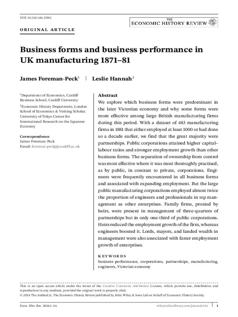 DOI: 10.1111/ehr.13392ORIGINAL ARTICLEBusiness forms and business performance in UK manufacturing 187181 James ForemanPeck1 1 Department of Economics, Cardiff Business School, Cardiff University 2