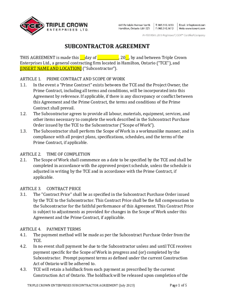 This agreement outlines the terms and conditions between Triple Crown Enterprises Ltd. and the subcontractor for the performance of work as specified in the Subcontract Purchase Order. It addresses