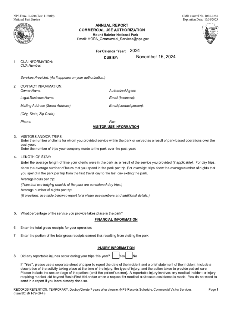 This form is used to submit an annual report for the Commercial Use Authorization at Mount Rainier National Park, detailing visitor use information, financial information, and injury reports.