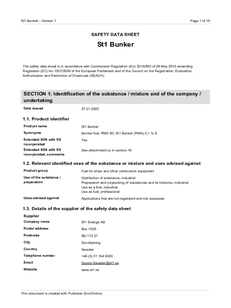 The safety data sheet outlines information related to the St1 Bunker fuel, including its identification, hazards, composition, and emergency measures in accordance with EU regulations.