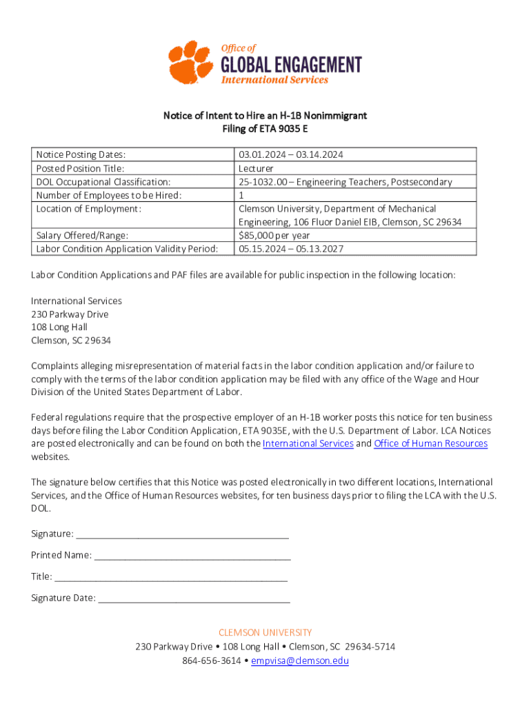 This document serves as a notification of the intent to hire a nonimmigrant worker under the H-1B visa program. It includes details such as the position title, classification, number of employees