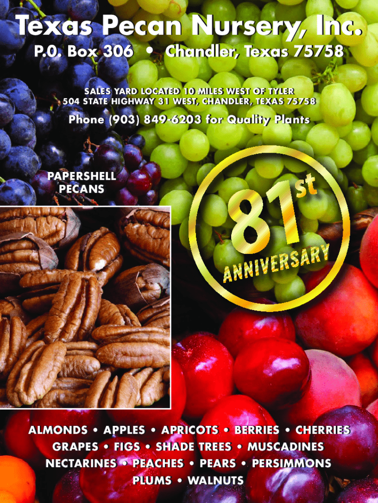 Texas Pecan Nursery, Inc. S 2 2 0 2 L L A F P.0. Box 306 L Chandler, Texas 75758 E WHO ESAL SALES SALES YARD YARD LOCATED LOCATED 10 10 MILES MILES WEST WEST OF OF TYLER TYLER 504 504 STATE STATE