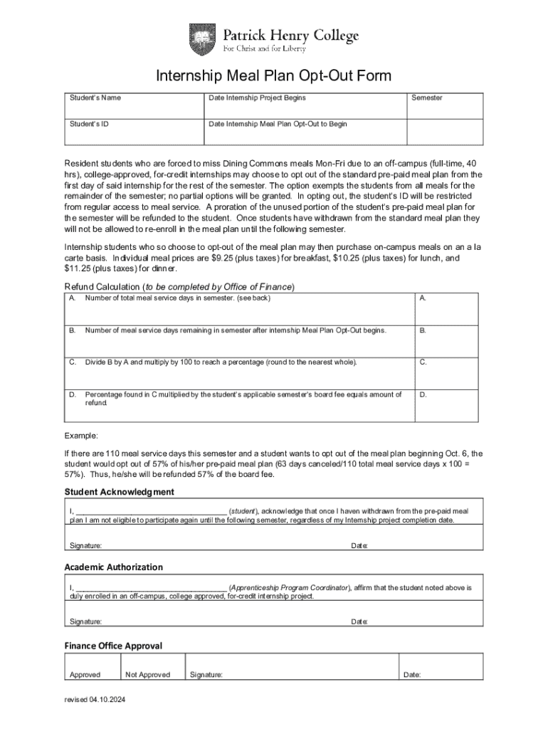 To fill out the internship meal plan opt-out, students typically need to complete a designated form provided by the institution, which may require personal details, the internship employer's information, and a statement of opting out.