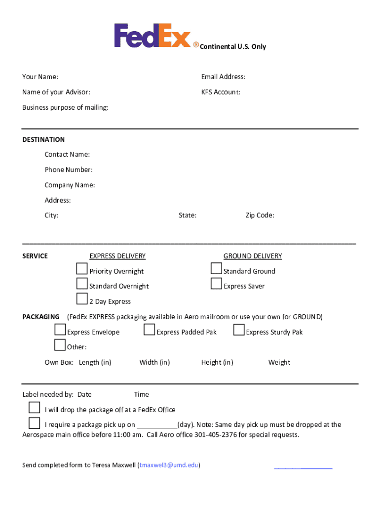 Continental U.S. OnlyYour Name:Email Address:Name of your Advisor:KFS Account:Business purpose of mailing:DESTINATION Contact Name: Phone Number: Company Name: Address: City:State:Zip Code:___ SERVICEEXPRESS