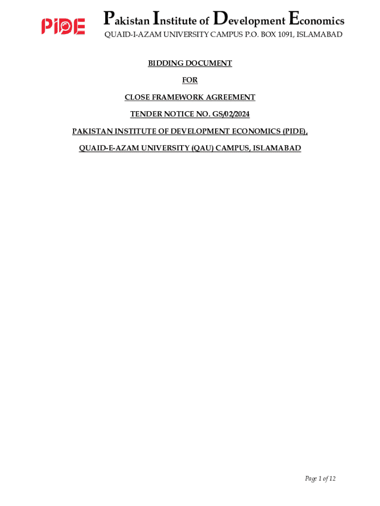 This document outlines the bidding process for a close framework agreement at the Pakistan Institute of Development Economics (PIDE) for general stationery and toilet/hygienic items. It includes details