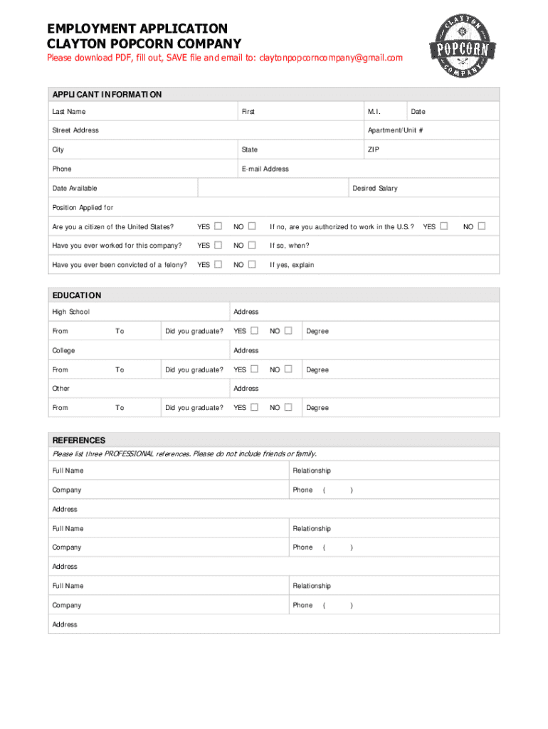 EMPLOYMENT APPLICATION CLAYTON POPCORN COMPANYPlease download PDF, fill out, SAVE file and email to: claytonpopcorncompany@gmail.comAPPLICANT INFORMATION Last NameFirstM.I.Street AddressDateApartment/Unit