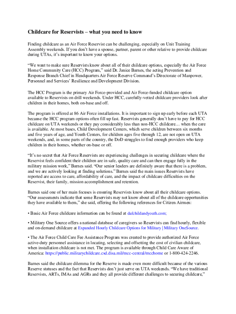Childcare for Reservists what you need to know Finding childcare as an Air Force Reservist can be challenging, especially on Unit Training Assembly weekends. If you dont have a spouse, partner, parent