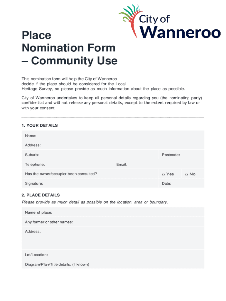 Este formulario de nominación ayudará a la Ciudad de Wanneroo a decidir si el lugar debe ser considerado para la Encuesta de Patrimonio Local, por lo que se debe proporcionar la mayor cantidad de