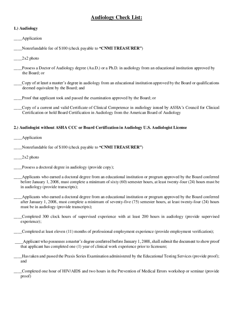 Health professionals such as audiologists, speech-language pathologists, and primary care providers are typically required to file an audiology check list after evaluating a patient's hearing.