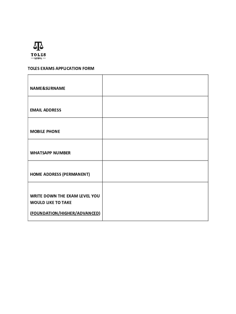 To fill out the TOLES exams application form, candidates need to provide personal information such as their full name, contact details, educational background, and any relevant legal experience. They must also select the specific exam they wish to take and provide payment information if required.