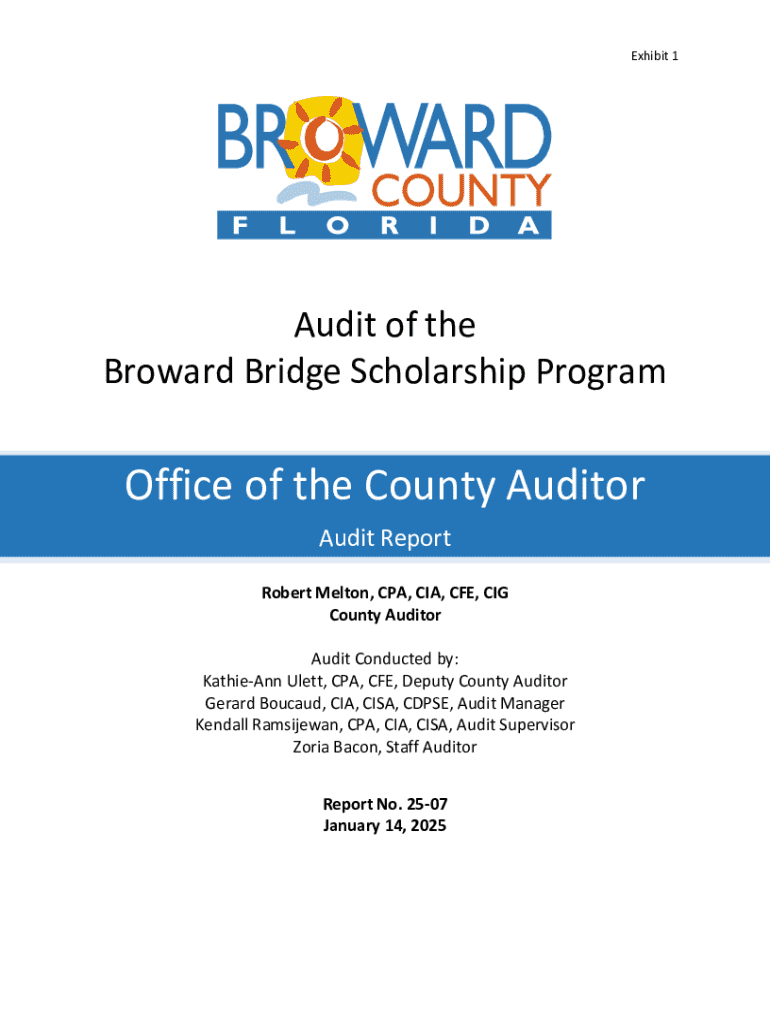 This audit report reviews the administration and effectiveness of the Broward Bridge Scholarship Program overseen by the Community Partnership Division, highlighting its compliance with contract terms,