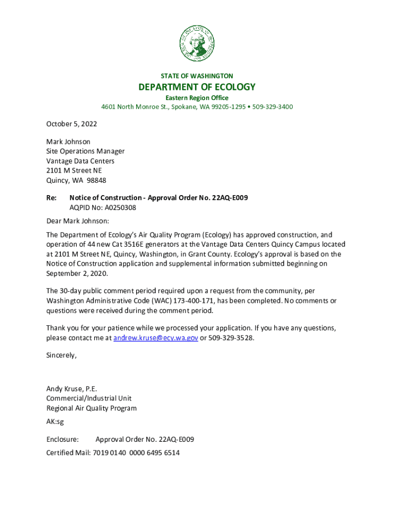 Approval Order issued by the Washington Department of Ecology for the construction and operation of new generators at Vantage Data Centers in Quincy, Washington. It includes details on equipment specifications,