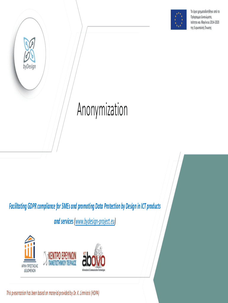 AnonymizationFacilitating GDPR compliance for SMEs and promoting Data Protection by Design in ICT productsand services (www.bydesignproject.eu)This presentation has been based on material provided