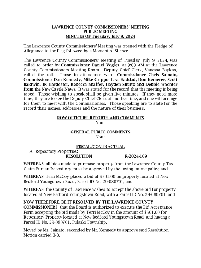 This document contains the minutes from the Lawrence County Commissioners\' meeting held on July 9, 2024. It includes details such as the meeting\'s opening, attendance, resolutions passed, public