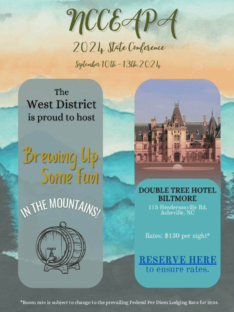 Registration form for the NCCEAPA 2024 State Conference held from September 10th to 13th, 2024, in Asheville, NC. The form includes information on registration fees, accommodation rates, and optional