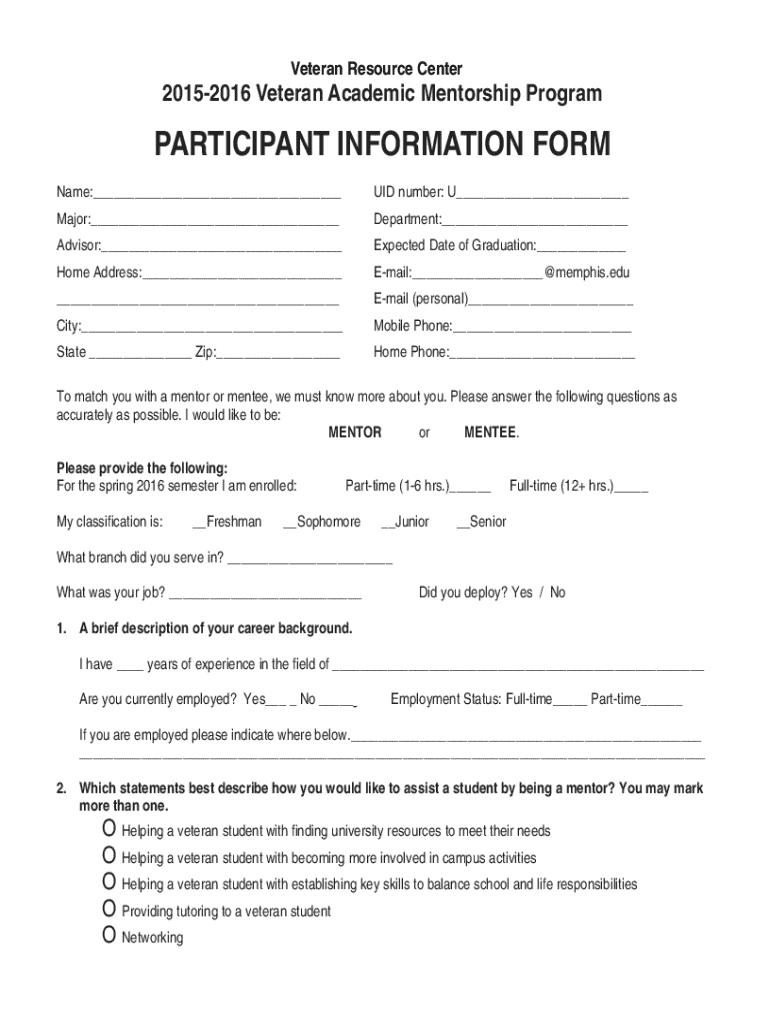 Get the free Veteran Academic Mentorship Program Participant Information Form