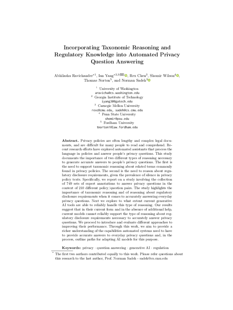 Incorporating Taxonomic Reasoning and Regulatory Knowledge into Automated Privacy Question Answering Abhilasha Ravichander1 , Ian Yang2,3( ) , Rex Chen3 , Shomir Wilson4 , Thomas Norton5 , and Norman