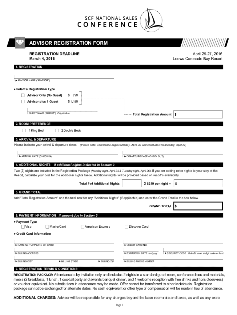 This form is for registering Advisors for the 2016 National Sales Conference, including details on registration types, costs, accommodations, payment information, and terms and conditions.