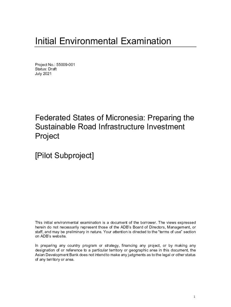 This document serves as an initial environmental examination for the Sustainable Road Infrastructure Investment Project in the Federated States of Micronesia. It assesses the environmental and social