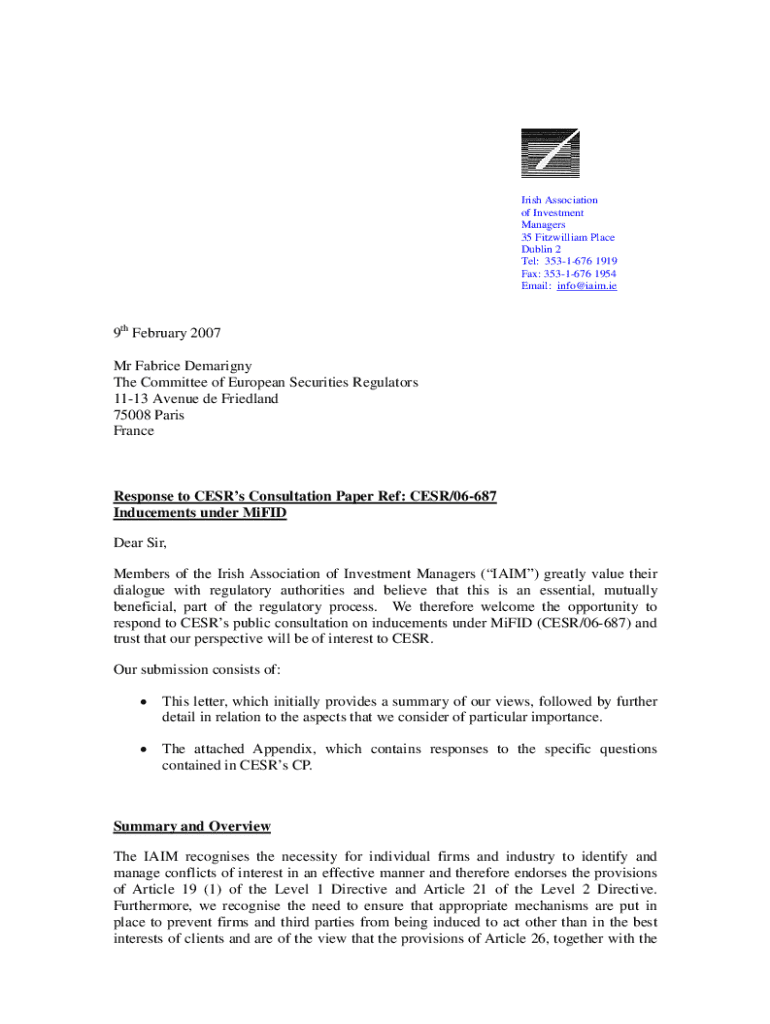 Irish Association of Investment Managers 35 Fitzwilliam Place Dublin 2 Tel: 3531676 1919 Fax: 3531676 1954 Email: info@iaim.ie9th February 2007 Mr Fabrice Demarigny The Committee of European Securities