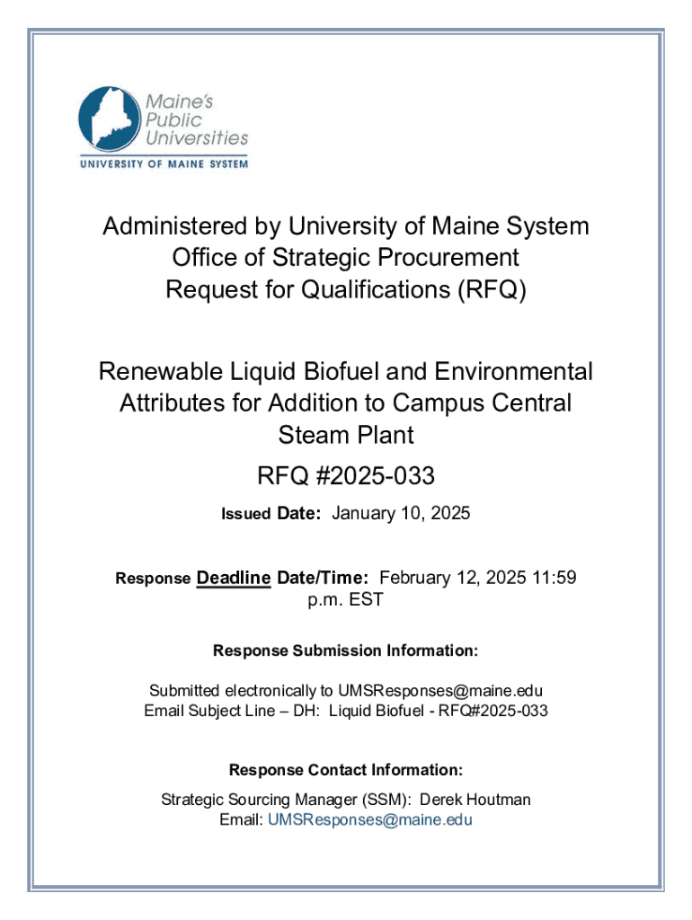This document outlines the Request for Qualifications (RFQ) for the supply of Renewable Liquid Biofuel (RLB) and associated environmental attributes for the University of Maine\'s Central Steam Plant